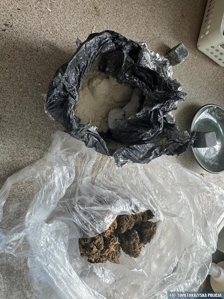 24-letni mieszkaniec Skarżyska-Kamiennej był w zainteresowaniu skarżyskich kryminalnych od pewnego czasu. W czwartkowe przedpołudnie policjanci pojawili się w mieszkaniu mężczyzny. Przeszukując pomieszczenia natknęli się na pakunek zawinięty w folię aluminiową, który znajdował się na parapecie okna. We wnętrzu ujawniono biały proszek w ilości blisko 70 gramów. Kolejne podejrzane substancje w postaci suszu znaleziono w worku foliowym o wadze ponad 10 gramów. Narkotyki trafiły do szczegółowych badań, a mężczyzna noc spędził w policyjnej celi.