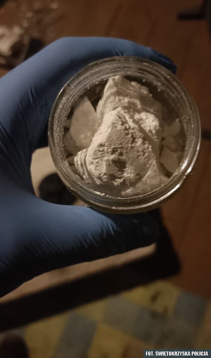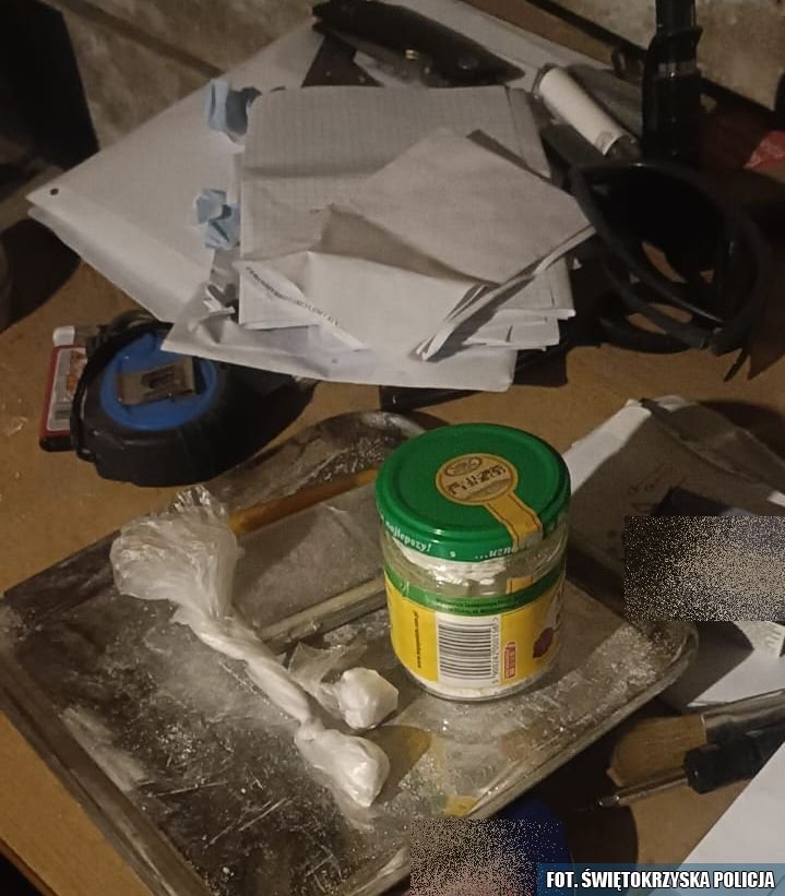 Skarżyscy kryminalni w czwartek po południu pojawili się w mieszkaniu 46-latka ze Starachowic. Służbowa wizyta zakończyła się zatrzymaniem mężczyzny. Podczas czynności uwagę policjantów przykuła otwarta szuflada, w której ujawniono woreczki foliowe z zawartością białego proszku oraz wagę jubilerską. Przystąpiono do przeszukania pomieszczeń mieszkalnych i gospodarczych. Na kolejne substancje w postaci białego proszku policjanci natknęli się w salonie mieszkania, gdzie na stole w słoiku ujawniono zbrylony biały proszek. Zabezpieczone substancje poddano wstępnym badaniom, które wykazały, że jest to amfetamina. Mężczyzna noc spędził w policyjnej celi.