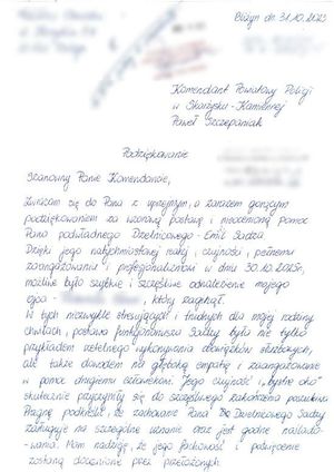 - Podziękowania od mieszkanki Bliżyna za pomoc dzielnicowego Na ręce Komendanta Powiatowego Policji w Skarżysku-Kamiennej wpłynął list z podziękowaniem autorstwa mieszkanki gminy Bliżyn w powiecie skarżyskim. Zawiera on wyrazy wdzięczności dla podkomisarza Emila Sadzy. Jego szybkie i skuteczne działania 30 października br. przyczyniły się do odnalezienia 81-letniego seniora. Wówczas o pomoc zwróciła się zaniepokojona rodzina.